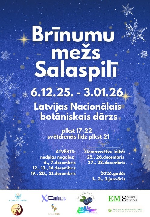 BRĪNUMU MEŽS 2025 ir maģisks labdarības pilotprojekts — Ziemassvētku sajūtu dārzs Salaspilī, Latvijas Nacionālajā botāniskajā dārzā.