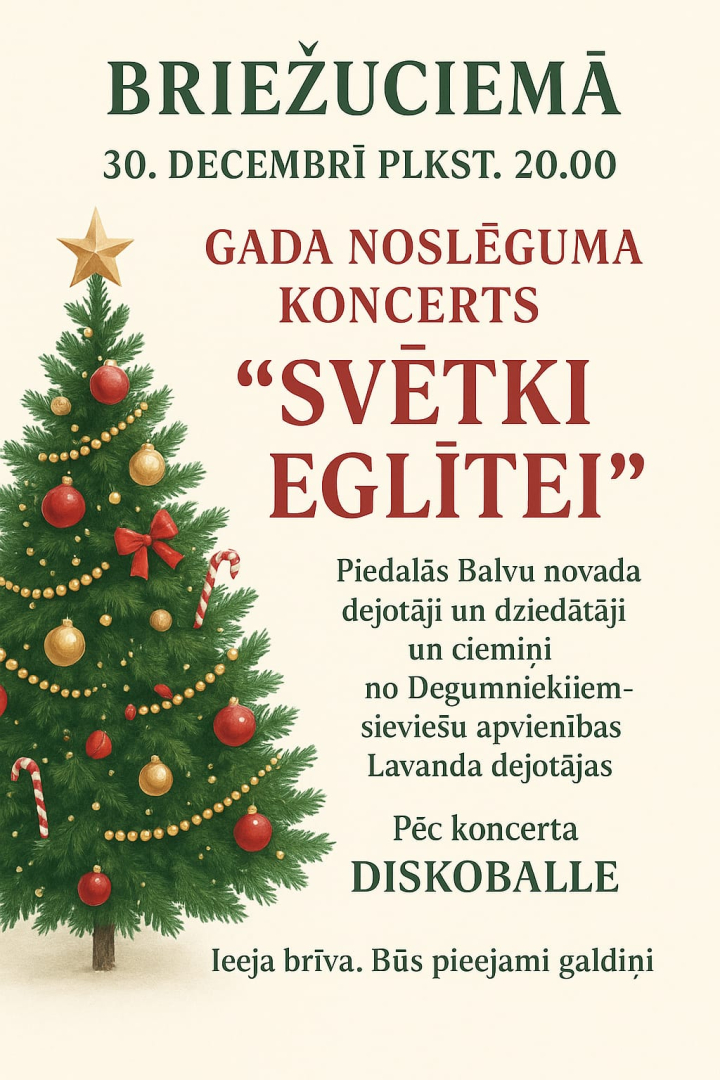 30. decembrī plkst. 20.00 Briežuciema Tautas namā – Gada noslēguma koncerts “Svētki eglītei”. Piedalās dziedātāji un dejotāji no Balvu novada, ciemiņi no Degumniekiem – sieviešu apvienības “Lavanda” dejotājas. Pēc koncerta diskoballe.