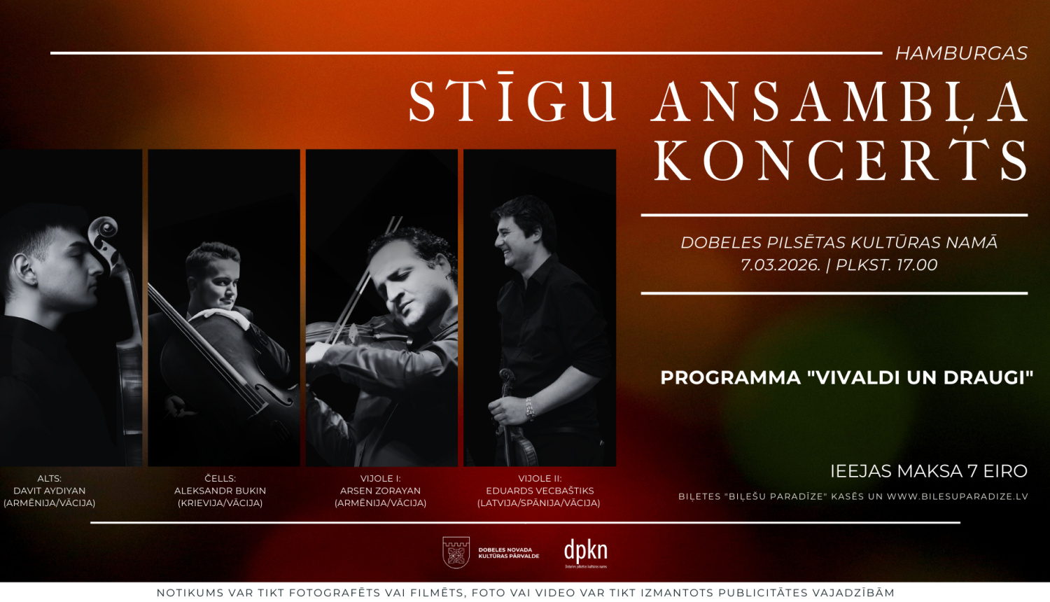 7. martā plkst. 18.00 aicinām uz Hamburgas stīgu ansambļa koncertu Dobeles pilsētas Kultūras namā. Biļetes “Biļešu Paradīze” kasēs, biļetes cena 7 eiro.