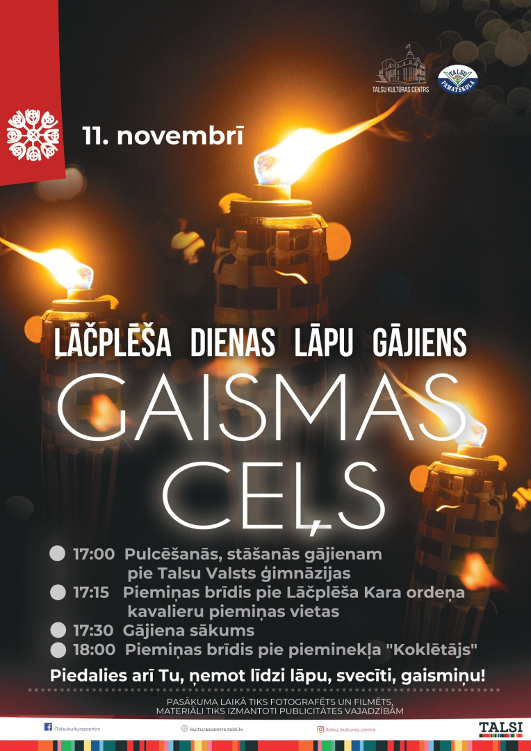 Aicinām jūs pievienoties Lāčplēša dienas lāpu gājienam „Gaismas ceļš”, kas notiks 11. novembrī plkst. 18.00, Talsos.