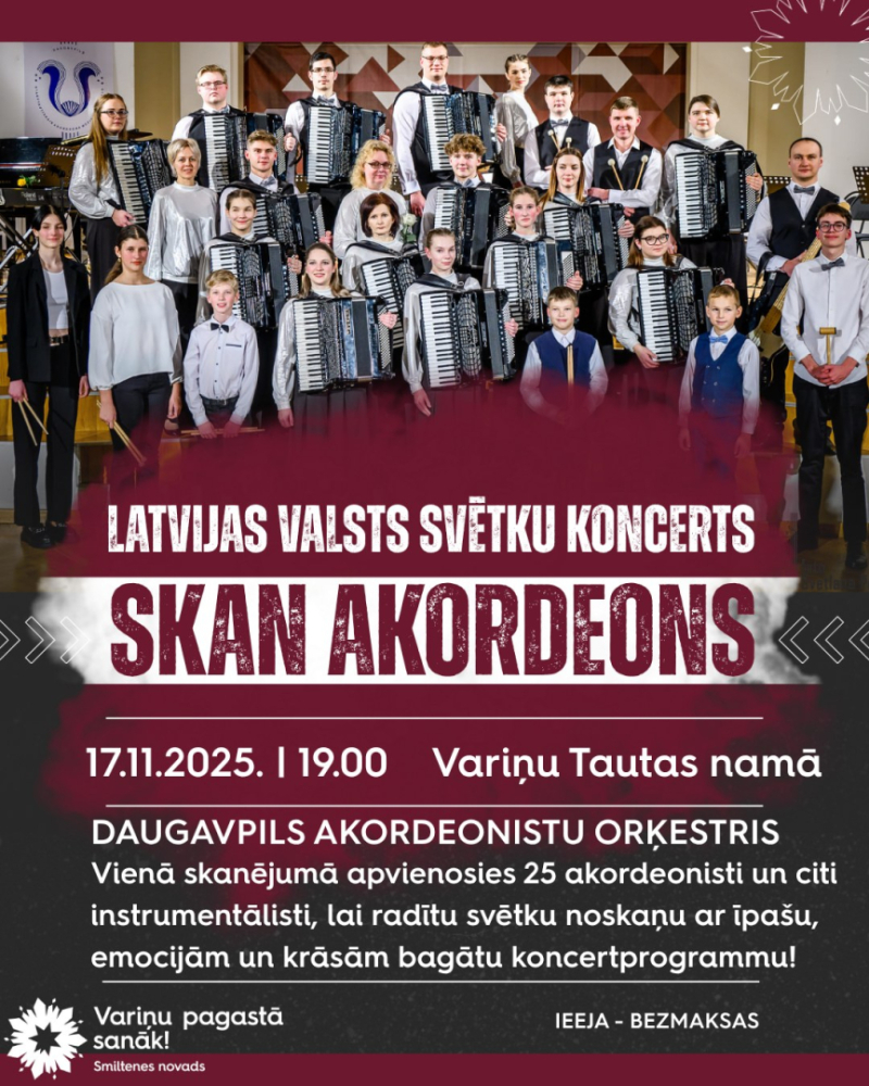 Daugavpils akordeonistu orķestris – jauni, talantīgi un radoši izpildītājmākslinieki – atskaņos spilgtu repertuāru, kurā iekļauti latviešu komponistu skaņdarbi dažādos stilos un noskaņās. Šis koncerts ir vēsturiska notikuma turpinājums – pirmo reizi Latvijas akordeonisti no visiem novadiem apvienojās kopīgā orķestrī Dziesmu un Deju svētkos. Tagad šī enerģija un vienotības spēks atskanēs arī Variņu Tautas namā, 17. novembrī pulksten 19.00!