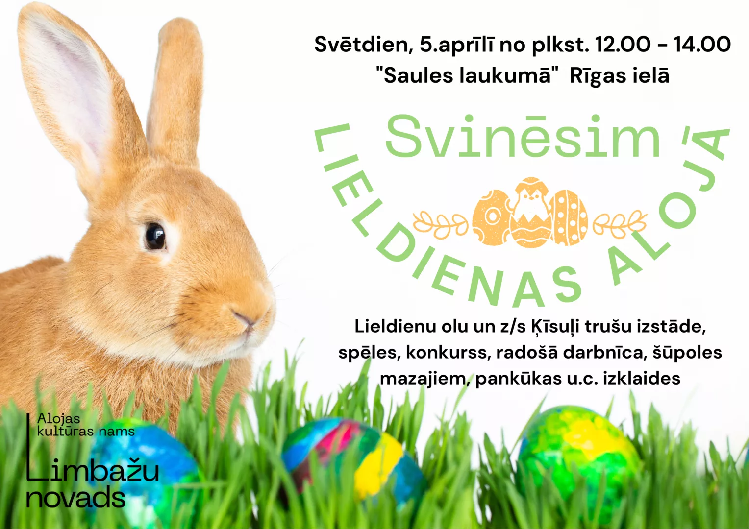 Svētdien, 5.aprīlī plkst.12.00 – 14.00 Saules laukumā Alojā (Rīgas iela 4a) svinēsim Lieldienu svētkus.