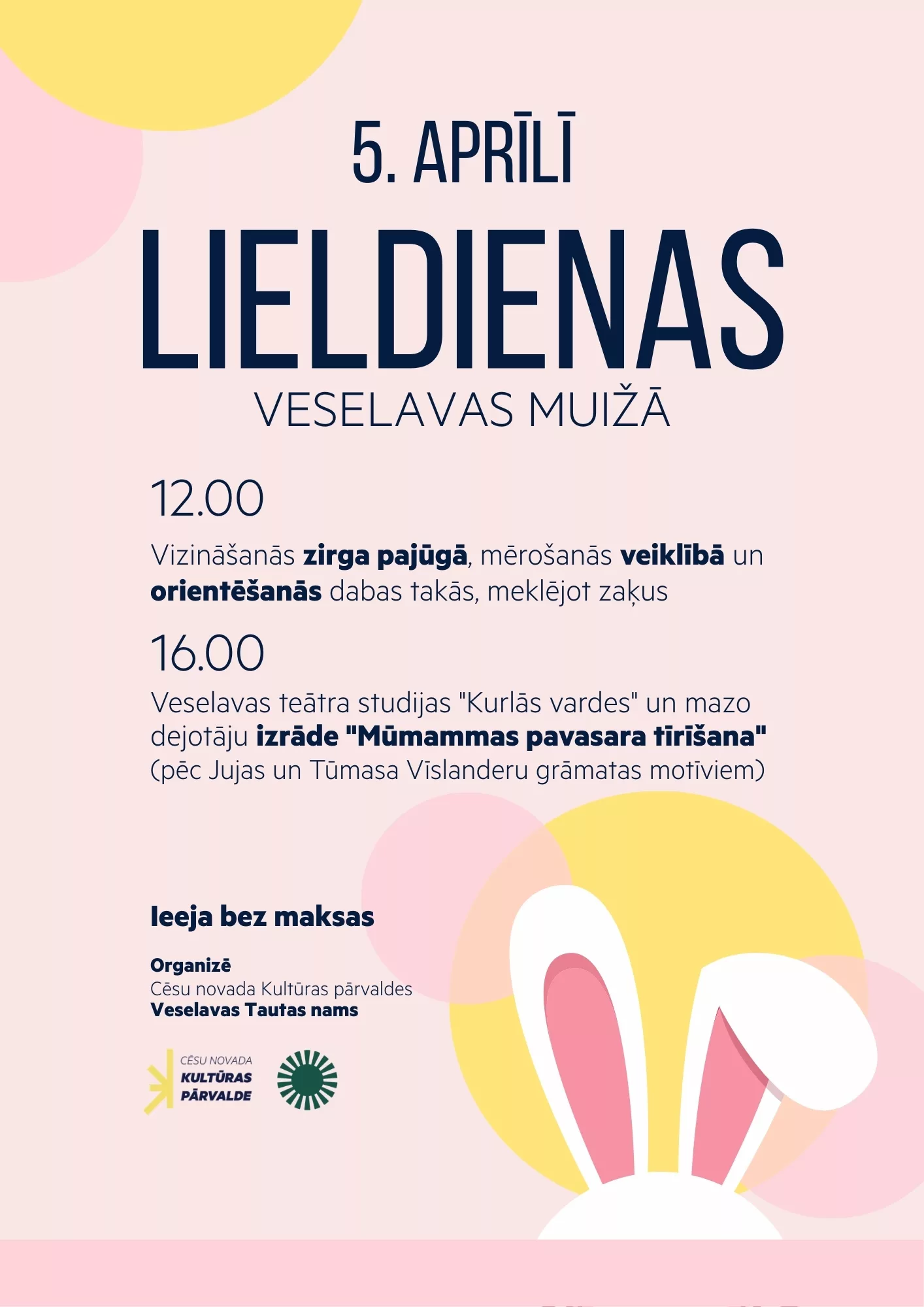 Pirmajās Lieldienās, 5. aprīlī, Veselavas muižā no plkst. 12.00 būs iespēja vizināties zirga pajūgā, mēroties veiklībā un orientēties dabas takās, meklējot zaķus.