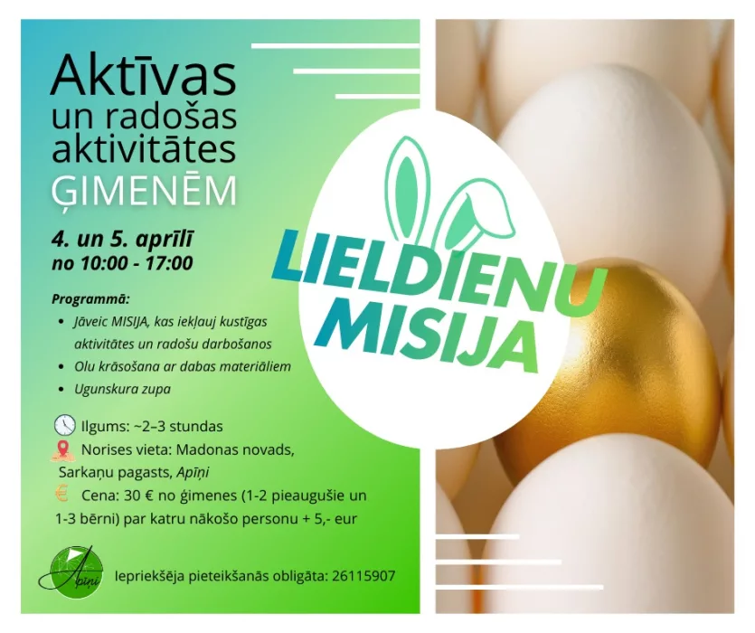 Lieldienu laikā ģimenes ar bērniem tiek aicinātas uz pavasara piedzīvojumu Madonas pievārtē – atpūtas kompleksā “Apīņi”! Pasākums vērsts uz kustību prieku, sadarbību, saliedēšanos un tradīciju izzināšanu.