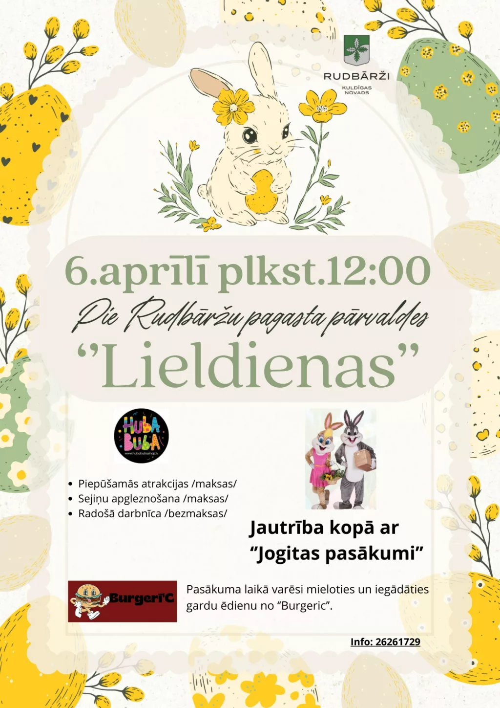 Aicinām svinēt Lieldienas Rudbāržos! Pasākumā gaidāmas piepūšamās atrakcijas bērniem, seju apgleznošana un radošā darbnīca. Par jautru noskaņu rūpēsies apvienība “Jogitas pasākumi” – Zaķis ar draugiem aicina piedalīties Lielās dienas svinībās ar krāsu jucekli, dziesmām un spēlēm. Pasākuma apmeklētājiem būs iespēja mieloties un iegādāties gardu ēdienu no “Burgeric”. Svinēsim un priecāsimies kopā!