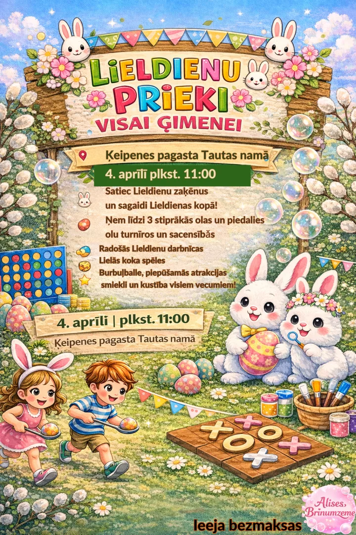 4. aprīlī plkst. 11.00 Ķeipenes Tautas namā / labos laika apstākļos ārā LIELDIENU PRIEKI VISAI ĢIMENEI.