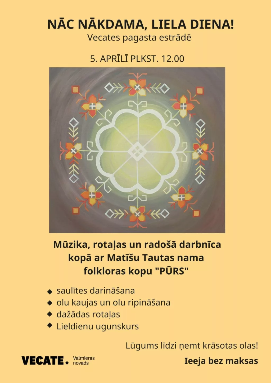 5. aprīlī plkst. 12.00 Vecates pagasta estrādē “Nāc nākdama, Liela diena!”. Mūzika, rotaļas un radoša darbošanās kopā ar Matīšu Tautas nama folkloras kopu “Pūrs”.