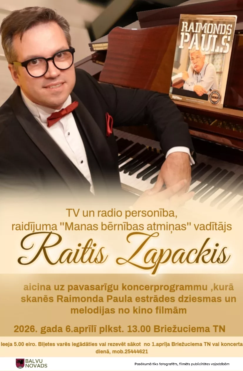 Briežuciema tautas namā Pavasara saulgriežu koncerts – uzstāsies radio un TV personība Raitis Zapackis ar Raimonda Paula estrādes dziesmām un melodijām no kinofilmām. Ieejas maksa: 5,00 eiro.