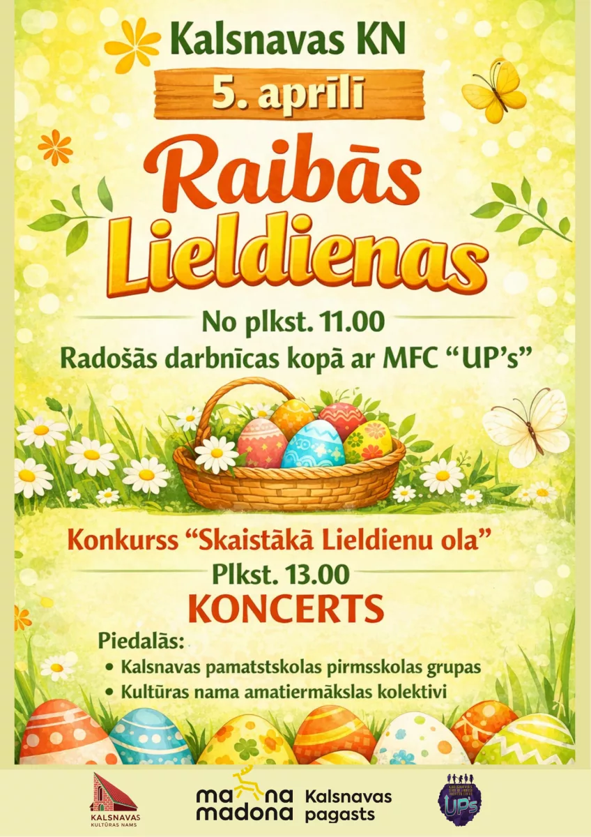 5. aprīlī Kalsnavas kultūras namā notiks pasākums “Raibās Lieldienas” – diena, kas piepildīta ar radošumu, mūziku un pavasarīgu noskaņu visai ģimenei.