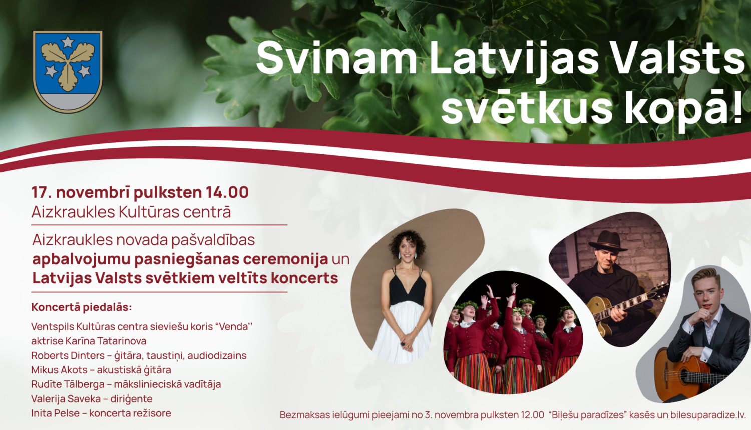 17. novembrī, pulksten 14.00, Aizkraukles kultūras centrā, Aizkraukles novada pašvaldības apbalvojumu pasniegšanas ceremonija un Latvijas Valsts svētkiem veltīts koncerts.
