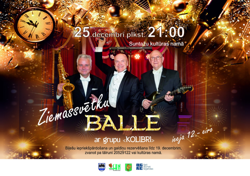 25. decembrī plkst. 21.00 Suntažu Kultūras namā Balle Ziemassvētkos ar grupu KOLIBRI